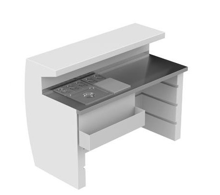 – Bancone neutro e Workstation L.cm.140; H piano d’appoggio cm.108; H piano lavoro cm.80; profondità cm.75