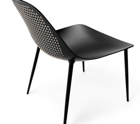 Seduta con scocca in pressofusione d’alluminio e struttura in metallo zincato, verniciata indoor/outdoor, non impilabile con 398 borchie.