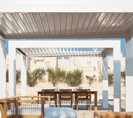 Flap, montato su strutture portanti in legno o in alluminio, garantisce uno schermo totale dal sole (modello FLAP) e un’ottima protezione anche dalla pioggia (6 mm/h) (modello FLAP Curvata) grazie alle alette orientabili provviste di guarnizioni ermetiche ed alle gronde laterali integrate e basculanti.
