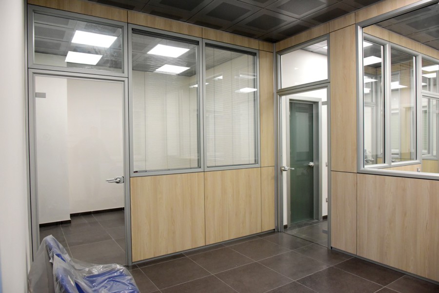 Realizzazione di pareti divisorie, per divisione uffici, da sp. cm.10 con moduli cieco/vetro con tendina interna, porte in vetro temperato da mm.10, moduli speciali con vetro passacarta.